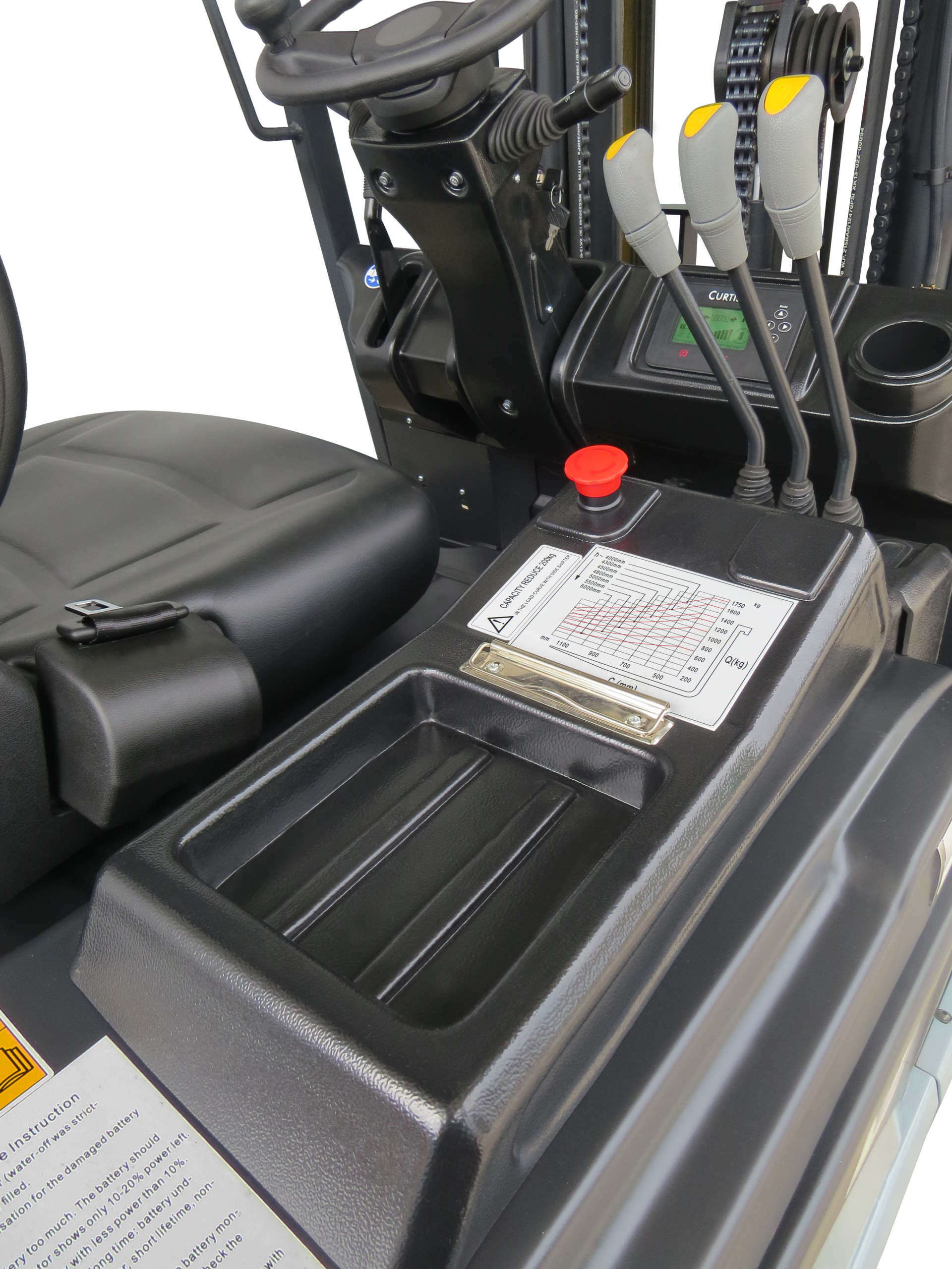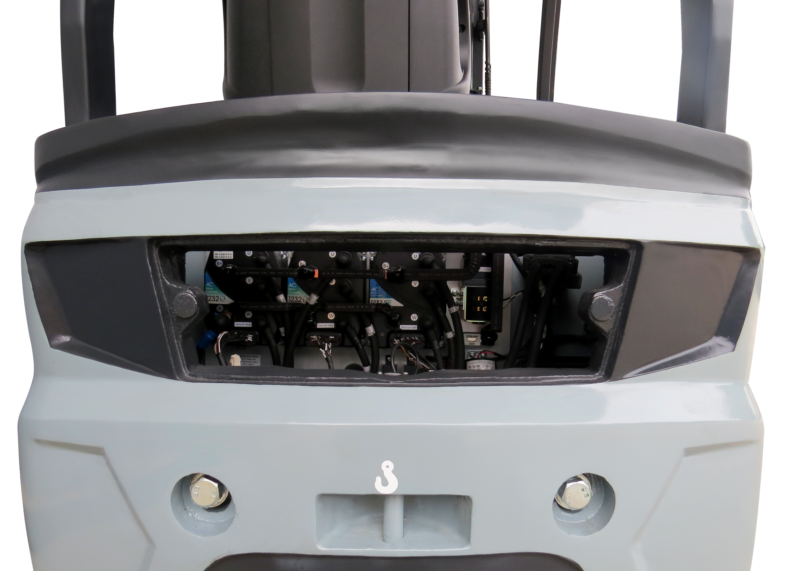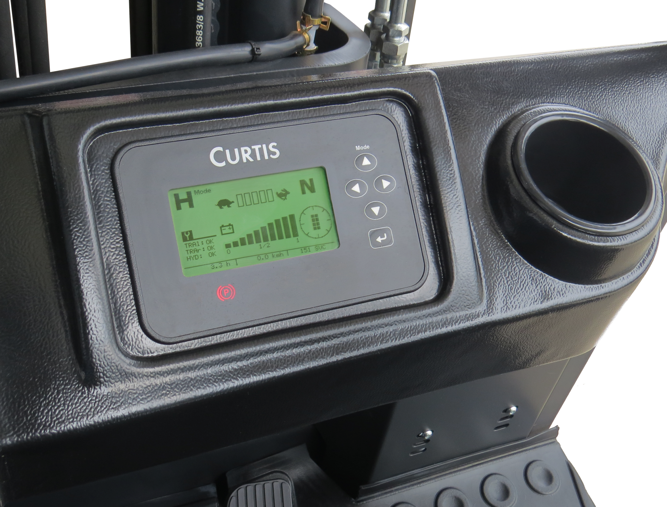 Painel Curtis reúne diversas informações para o operador, inclusive posição da roda, trabalha em conjunto com módulos Curtis e motores AC que combinam baixo consumo de energia, alto desempenho e manutenção extremamente reduzida.