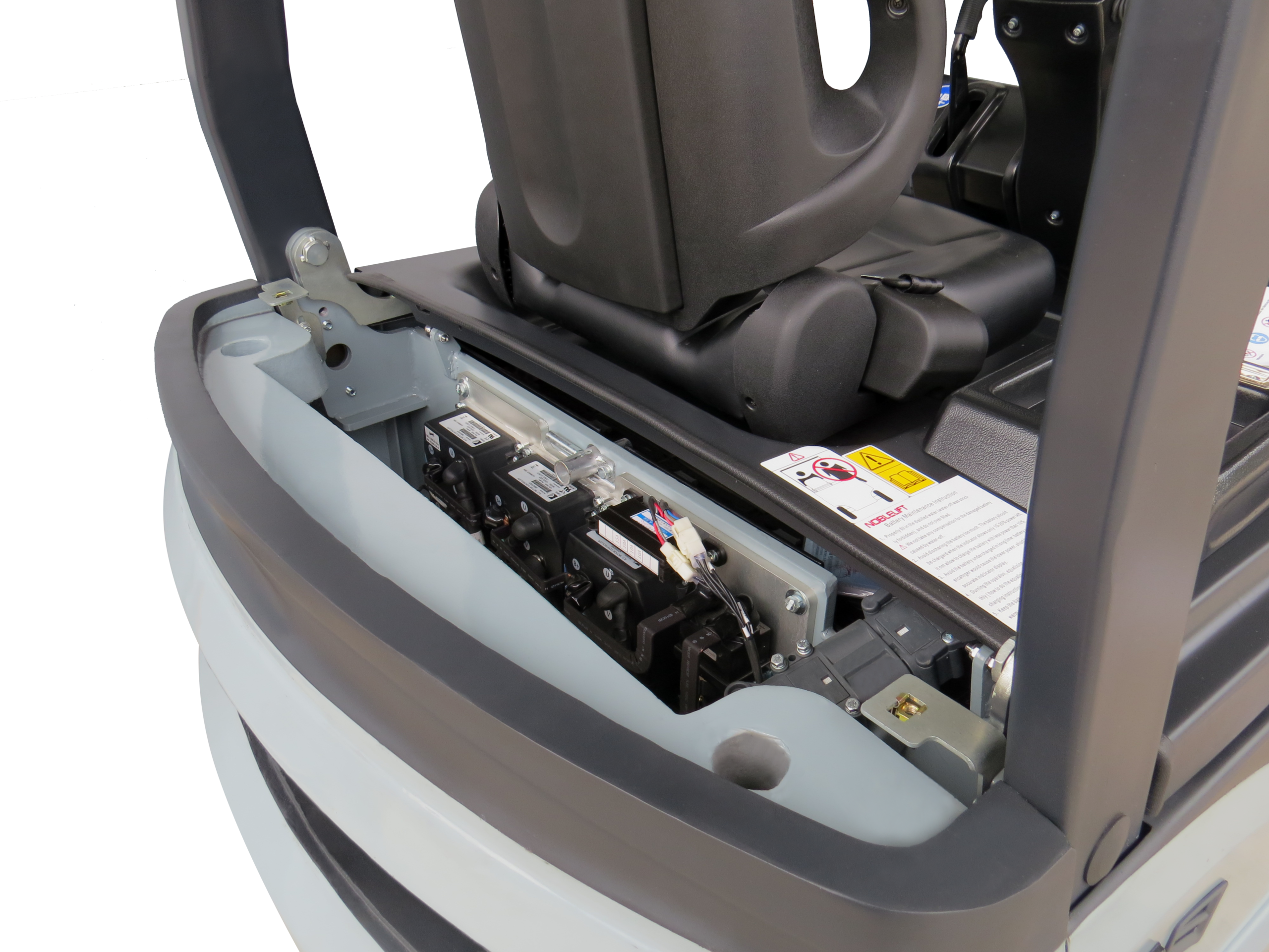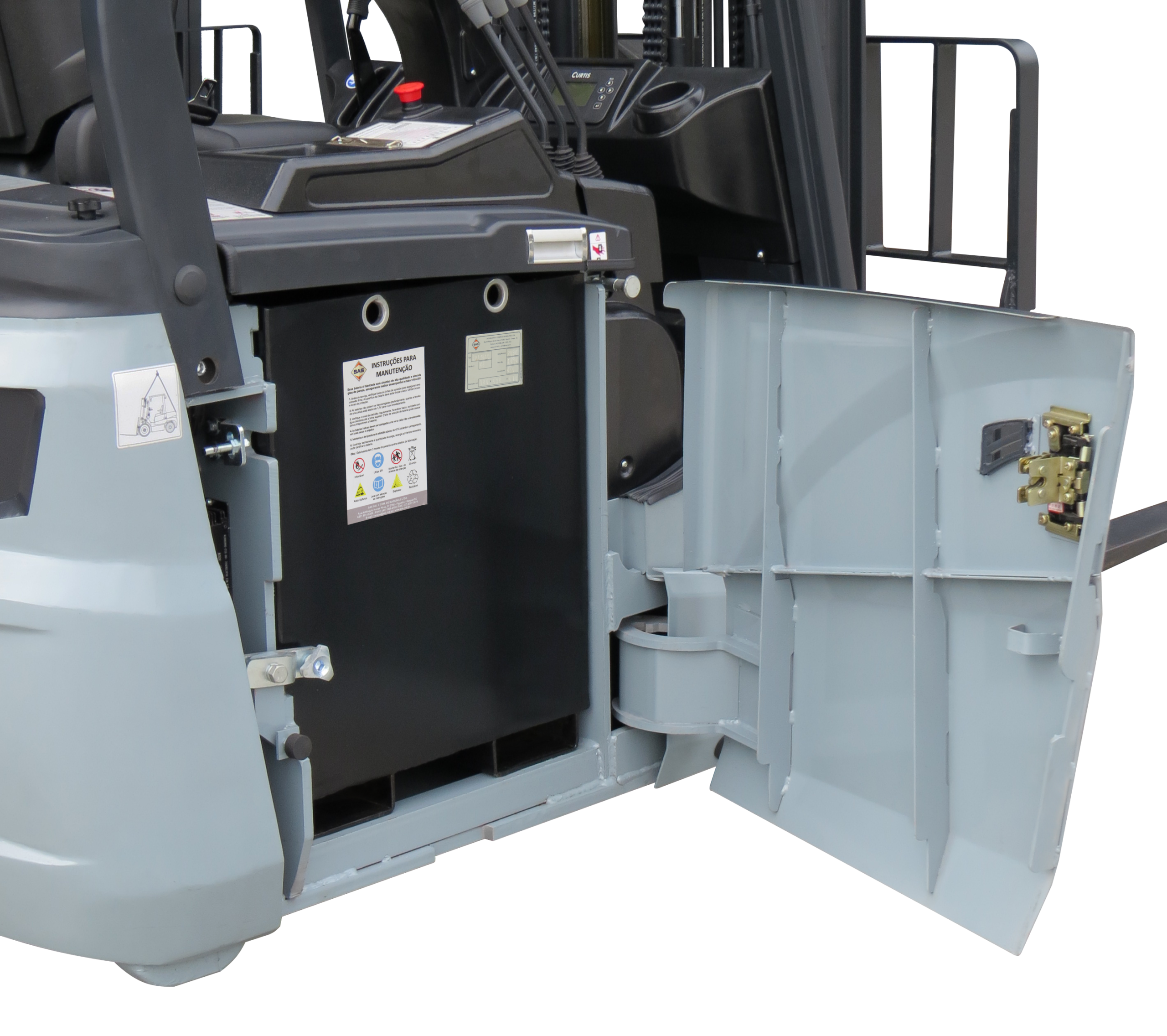 A saída lateral da bateria aumenta a produtividade pois reduz o tempo de troca entre turnos, além de aumentar a segurança pois não há necessidade de içamento.
